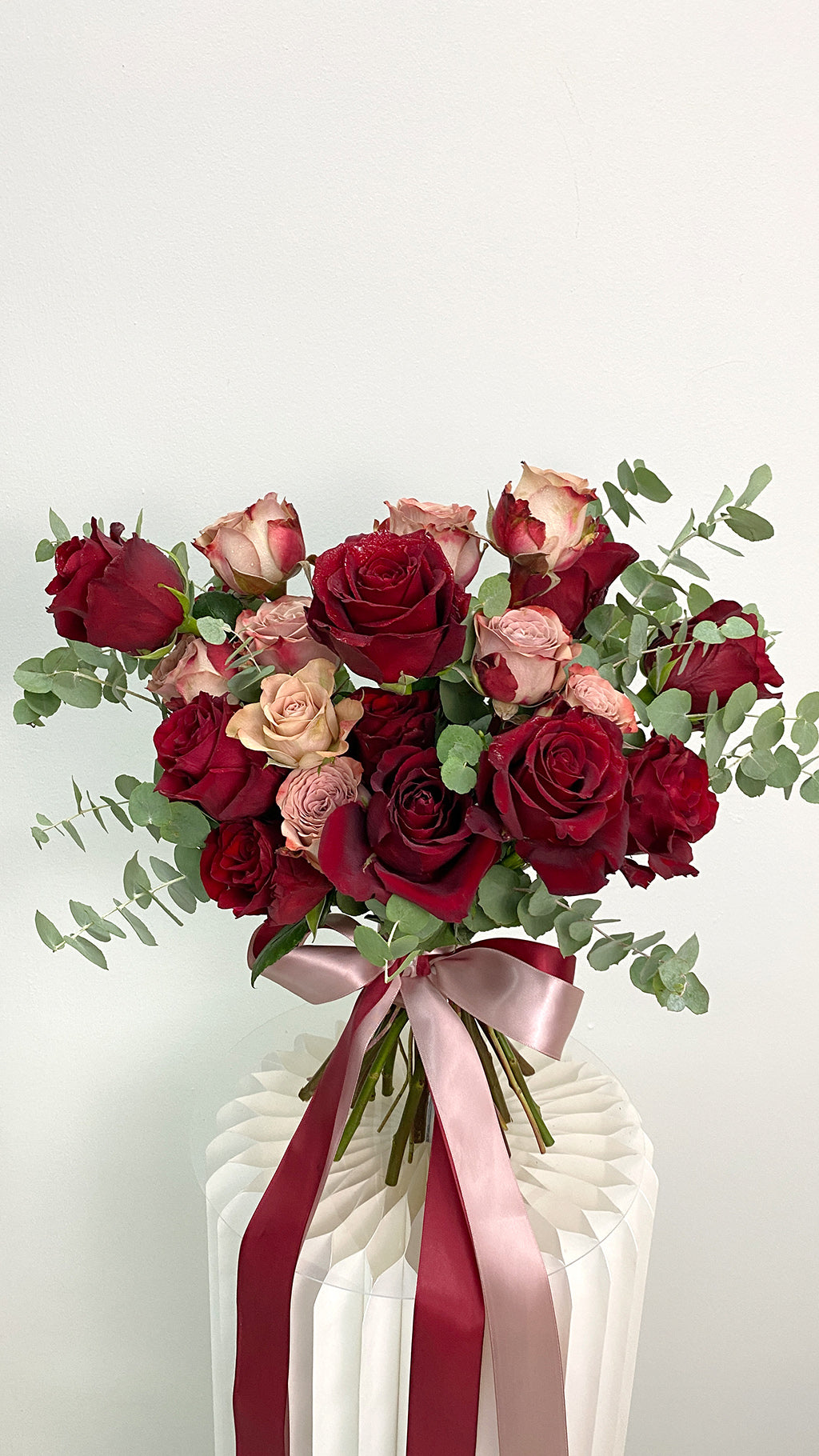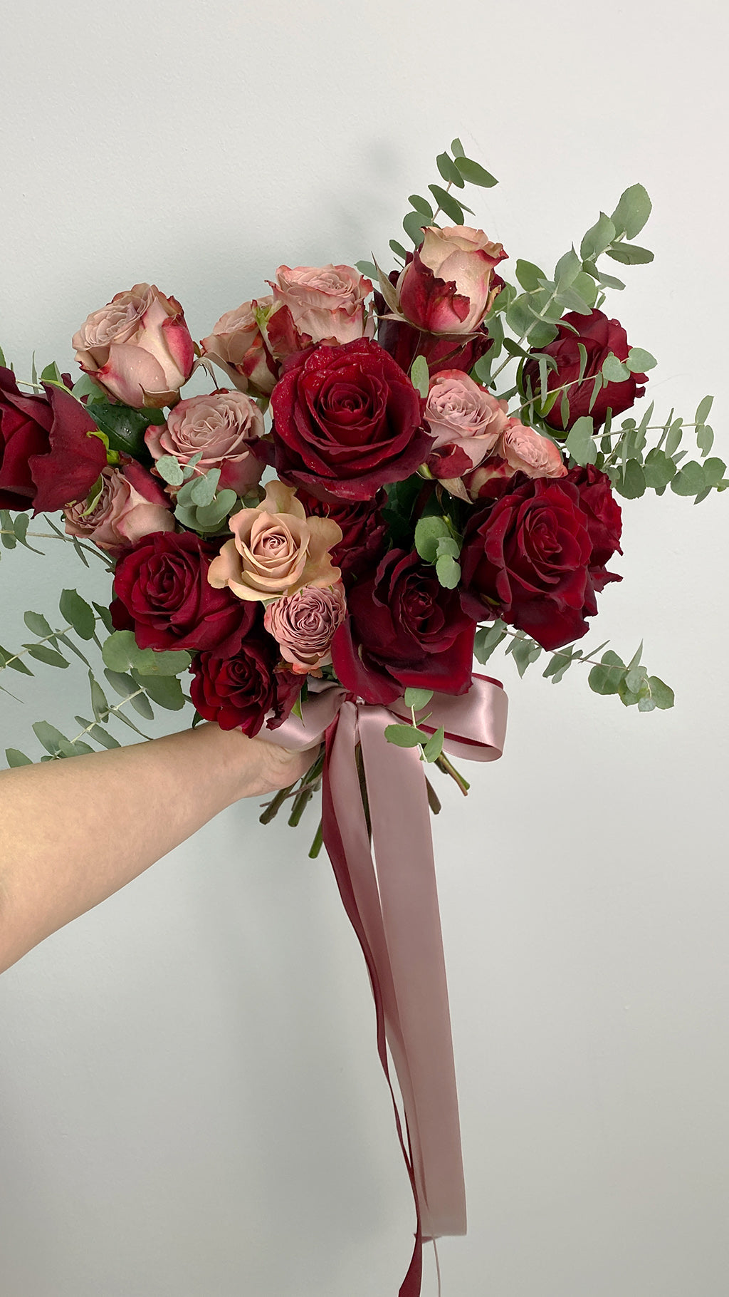 A rustic and elegant mix of dark red and cappuccino roses gracefully accompanied by the refreshing aroma of eucalyptus.