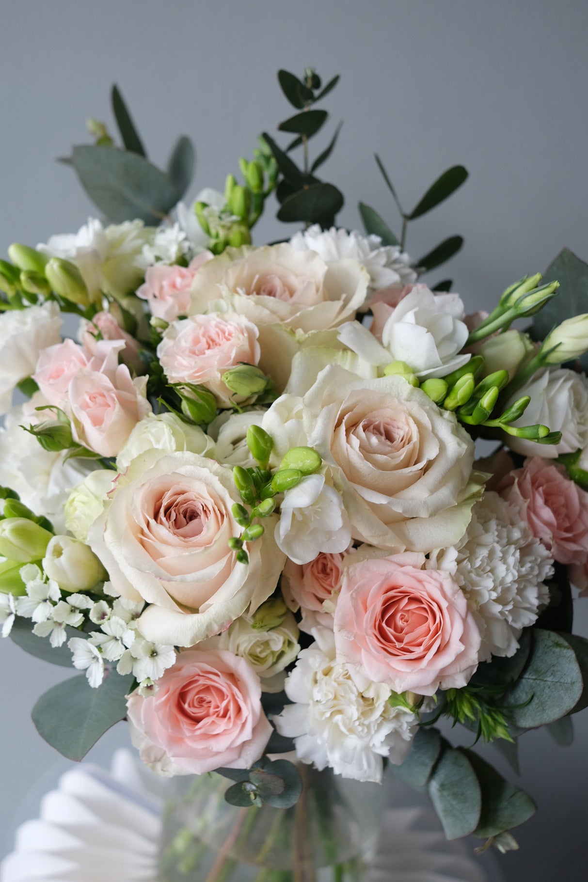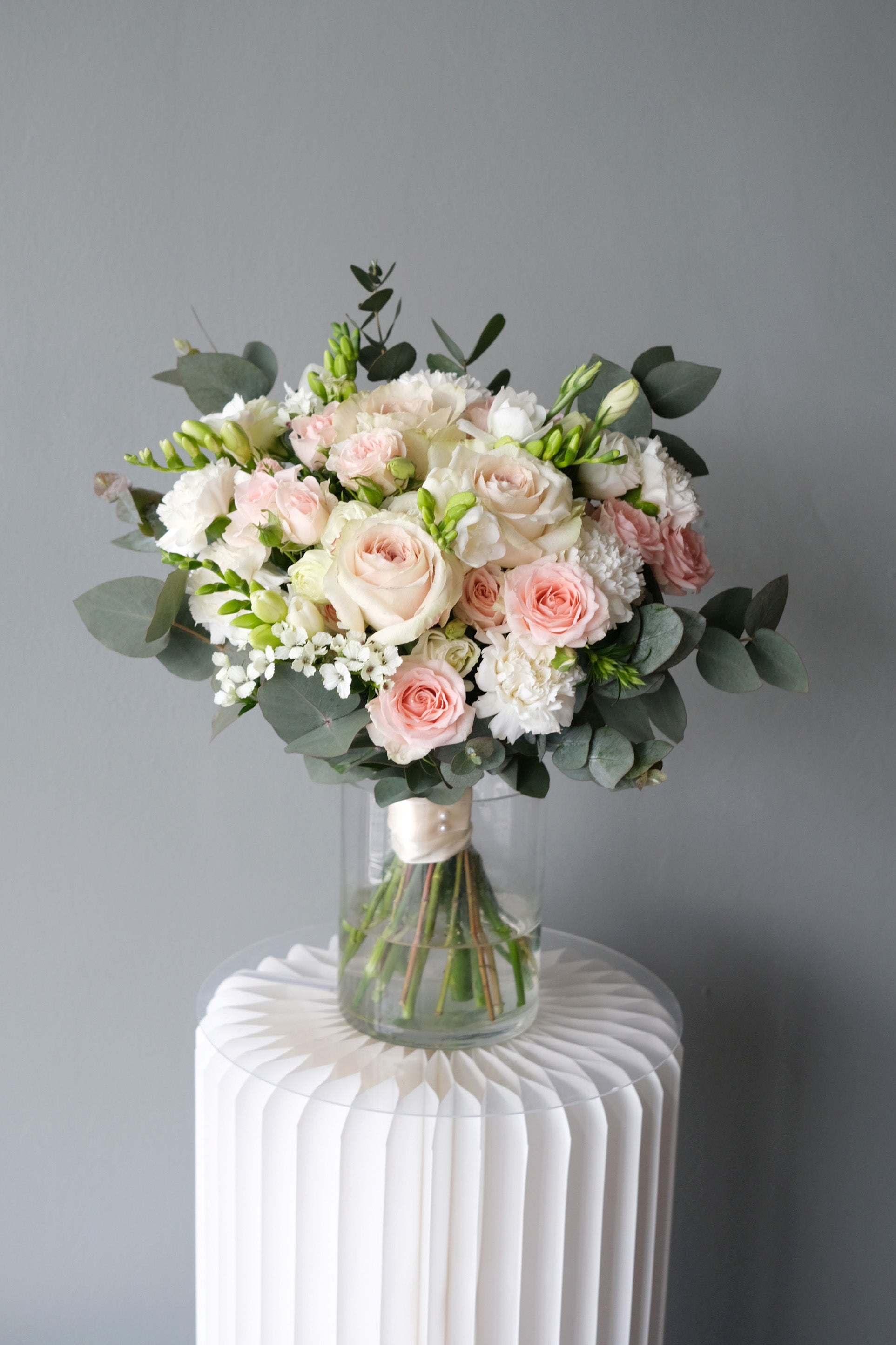 A classic elegant round bridal arrangement that gracefully marries the hues of classic pink and pristine white. This exquisite bouquet features a harmonious blend of quick sand roses, pink spray roses, freesia, eustoma, sweet william, and eucalyptus.