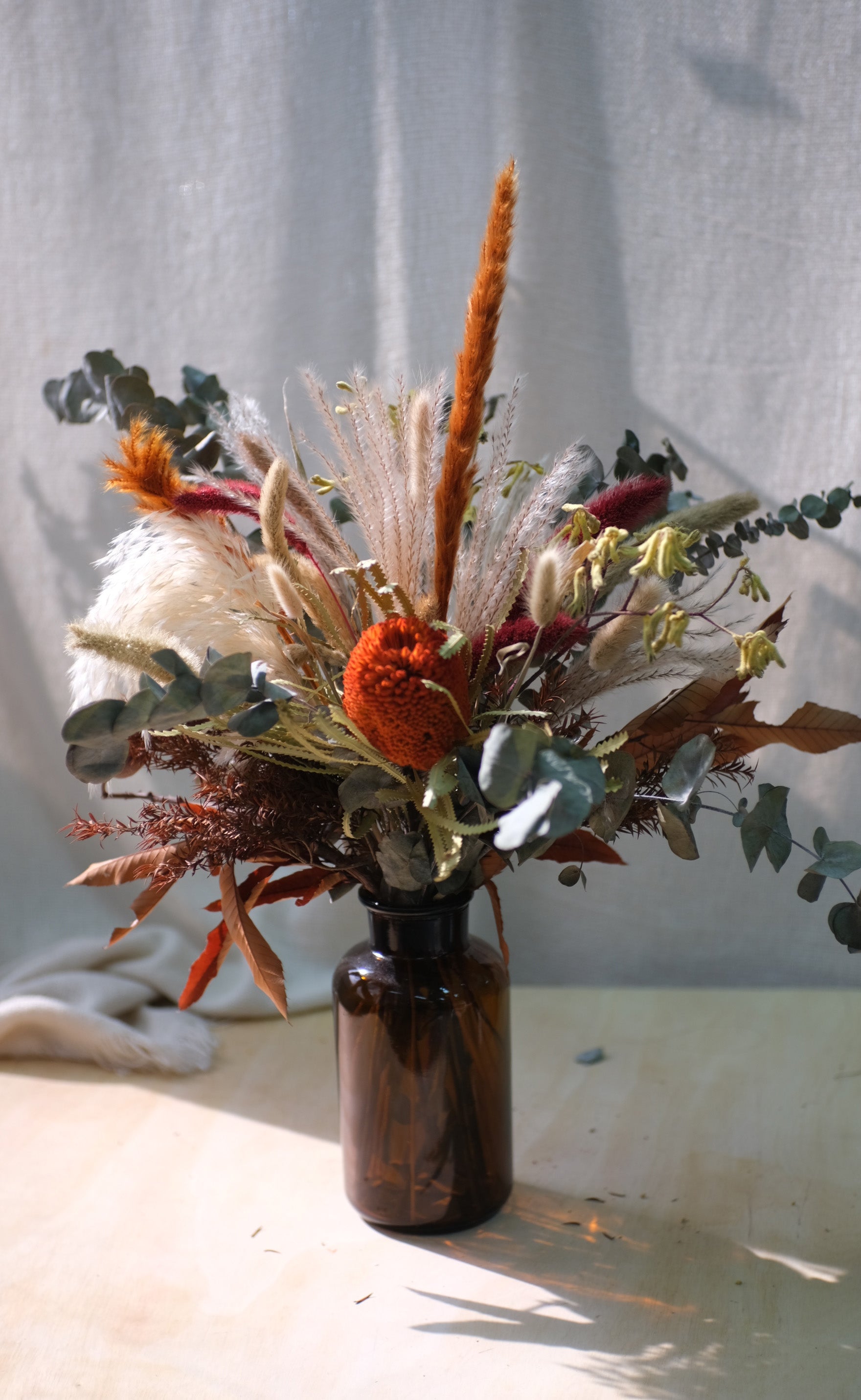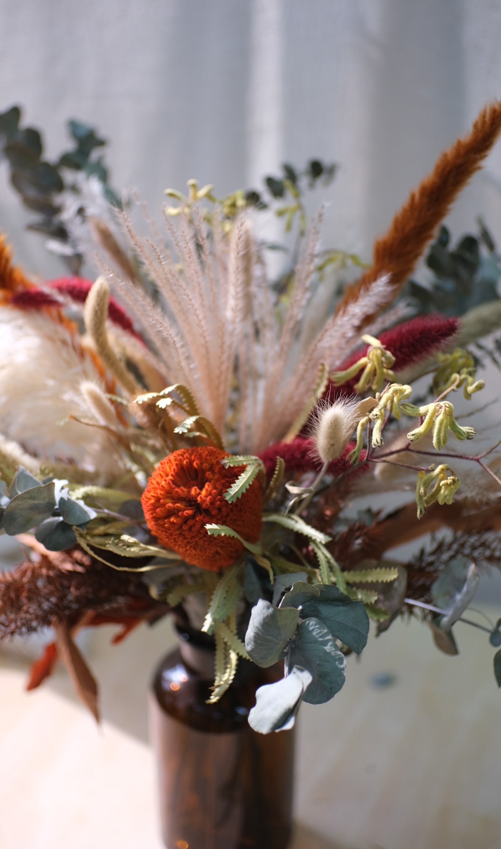 Warm, earthy tones of the season in this dried floral arrangement showcase the unique texture of Banksia, complemented by feathery pampas grass, wispy bunny tails, and dried eucalyptus. Nestled in an amber-hued vase, this mix of soft neutrals and vibrant rust tones exudes rustic charm, making it a perfect accent for any space seeking to capture the tranquil beauty of autumn.