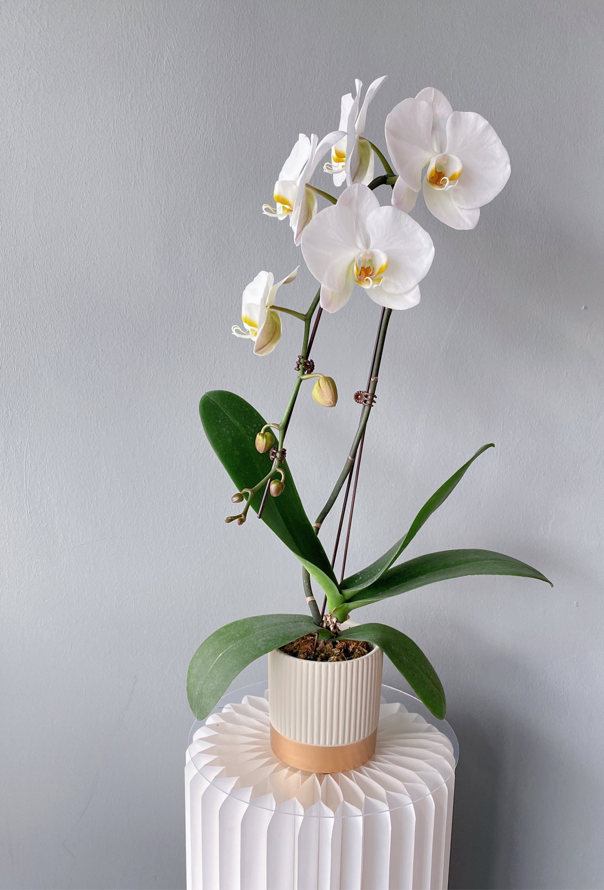 Phalaenopsis orchid effortlessly enhancing the ambiance of your space, especially during festive period. Delicately potted in a vase, these flowers not only captivate with their beauty but are also easy to care for.