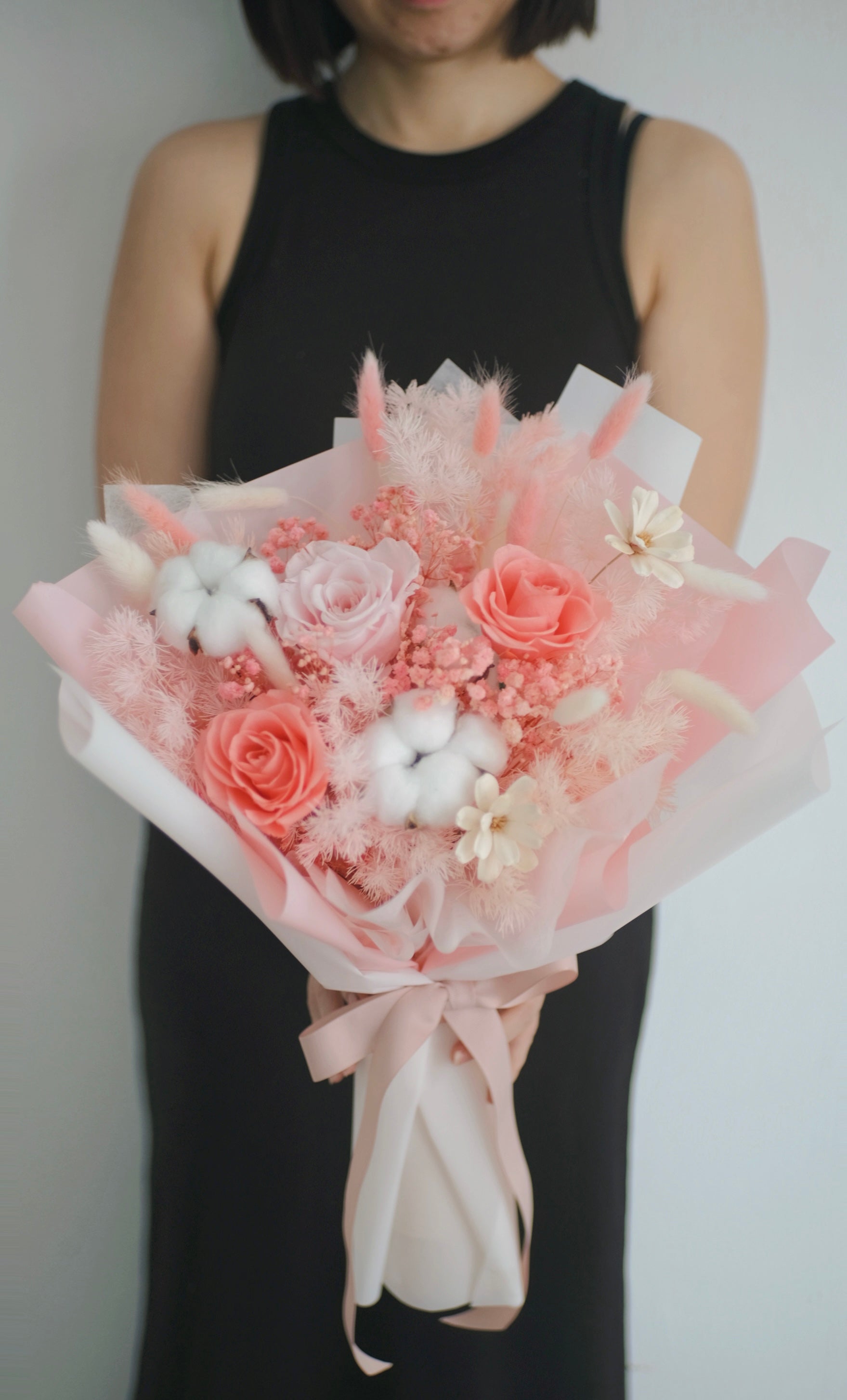 Soft as a dream, Cotton Candy is a preserved bouquet in delicate shades of blush and pastel pink. Featuring preserved roses, fluffy cotton blooms, and airy pink foliage, this sweet and whimsical arrangement captures the essence of romance. Wrapped in layers of soft pink, it’s the perfect Valentine’s gift to express love that lasts forever.