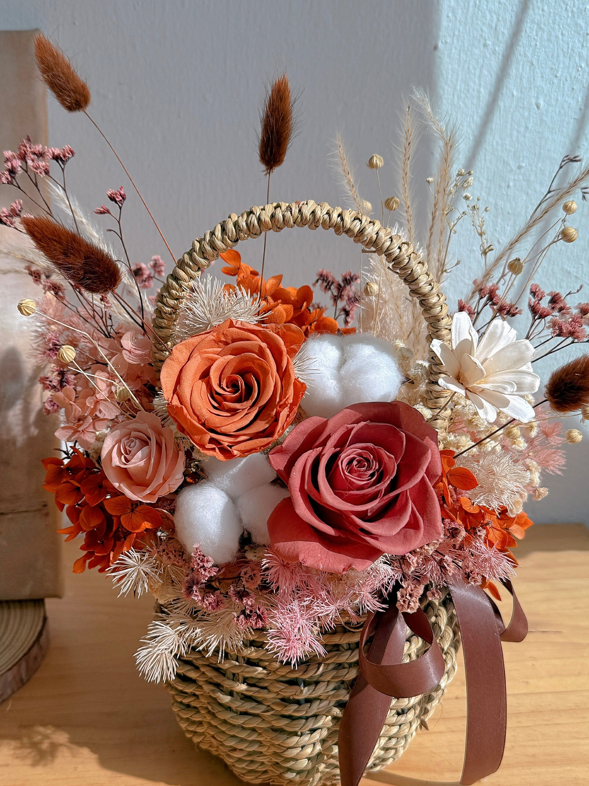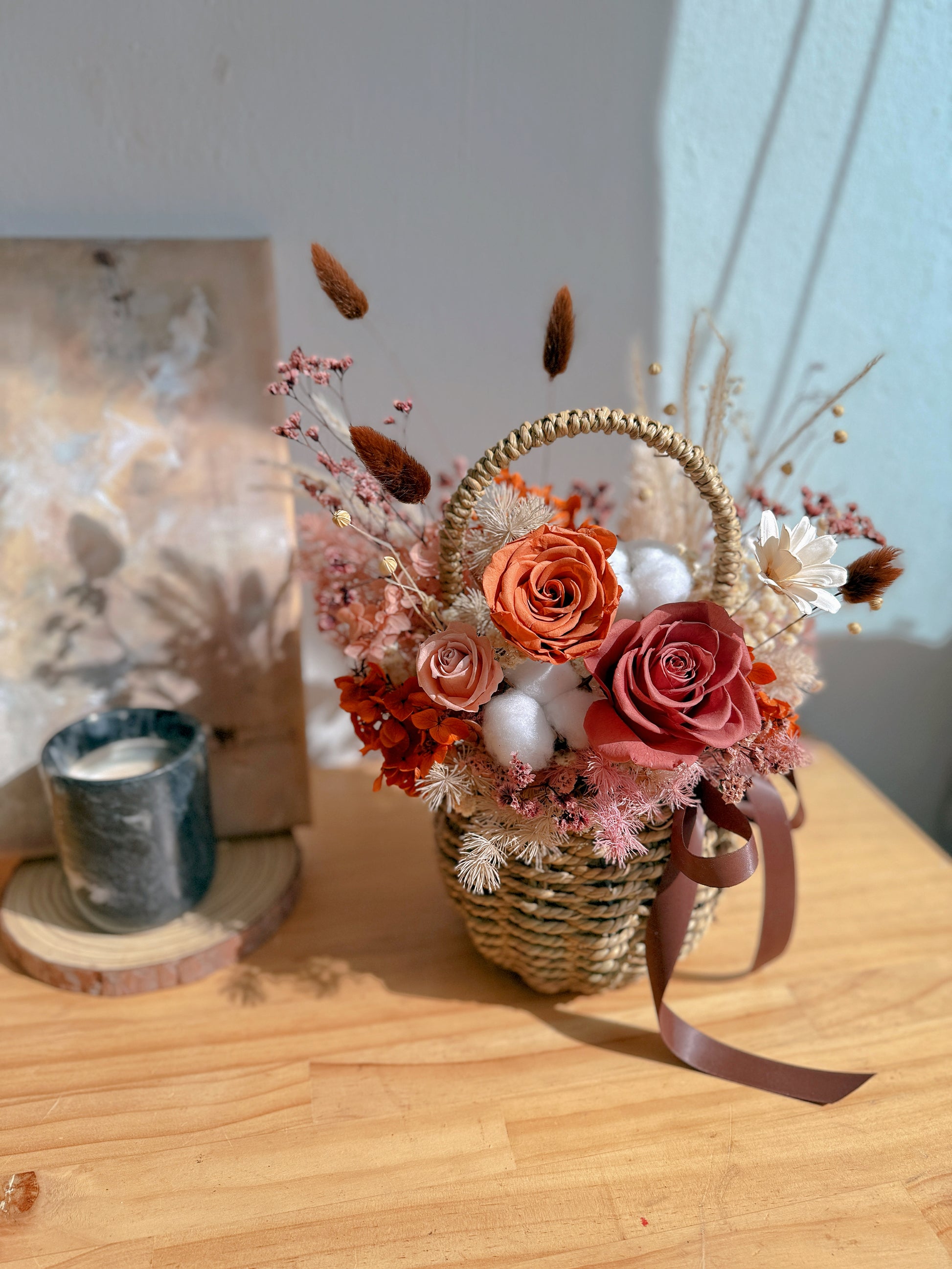 Inspired by the soft warmth of a cozy café, Café Crème Blossoms brings together a harmonious blend of preserved roses, dried blooms, and textured foliage in soothing mocha, blush, and cream tones. Thoughtfully arranged in a woven basket and tied with a satin ribbon, this long-lasting floral piece adds an elegant, earthy charm to any space. Perfect as a unique gift or a timeless accent for your home.