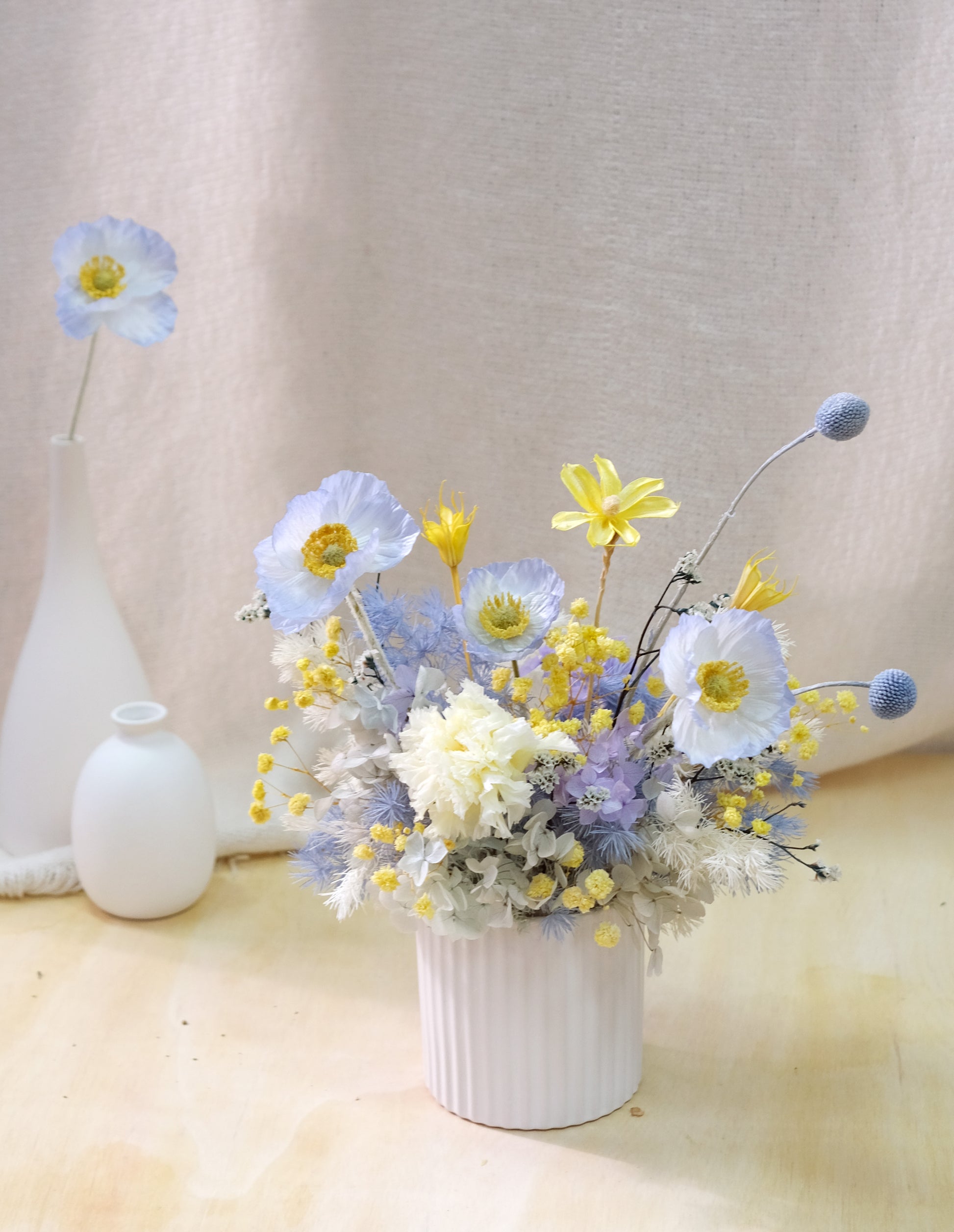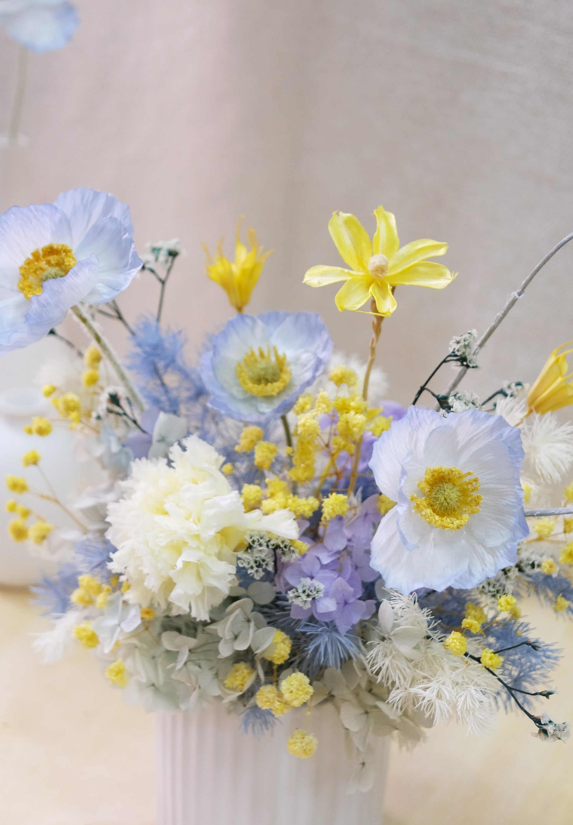 Inspired by a cool, refreshing cup of lemonade, this arrangement features a vibrant blend of blue and yellow preserved and faux florals. Flower arrangement consist of preserved carnation, hydrangea, baby breath and handmade wood flower and faux poppy housed in a fluted ceramic vase, designed to last through the summer, bringing refreshing colours and a touch of seasonal cheer to any space.